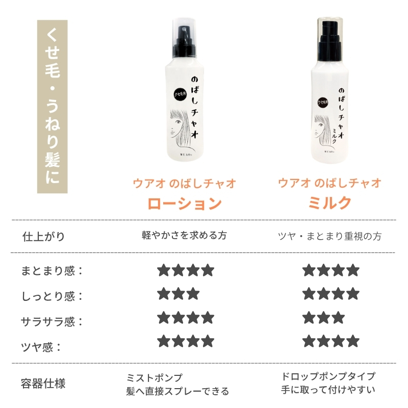 「のばしチャオ」は、オトナ髪の悩みに寄り添い、毎日のスタイリングを少しでも楽しくするために生まれました。熱を利用して髪の内側から整え、湿気から守る発想のトリートメントです。自分の髪質や仕上がりの好みに合わせて、ローションかミルクをお選び頂き、心地よい香りとともに一日中まとまる髪を楽しんでください。