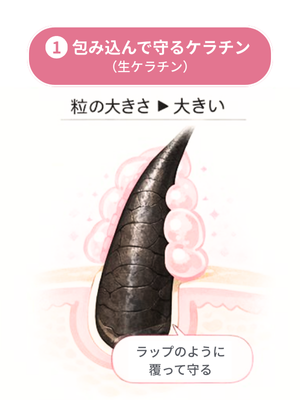① 包み込んで守るケラチン(生ケラチン)ラップのように、髪の表面をやさしく覆います。 ▸粒の大きさ:大きい |