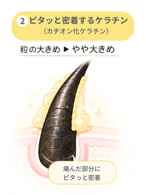 ② 密着するケラチン(カチオン化ケラチン)傷んだところを見つけて、ピンポイントでくっつく存在。 ▸粒の大きさ:やや大きめ |
