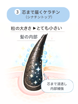 ③ 芯まで届くケラチン(シナチントップ) 弱くなった髪の“骨組み”を内側から立て直すケラチン。 ▸粒の大きさ:とても小さい |
