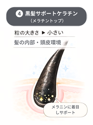 ④ 黒髪サポートケラチン(メラチントップ) 「今ある髪」だけでなく、「これから生えてくる髪」にも目を向けたケラチン。 ▸粒の大きさ:小さい |